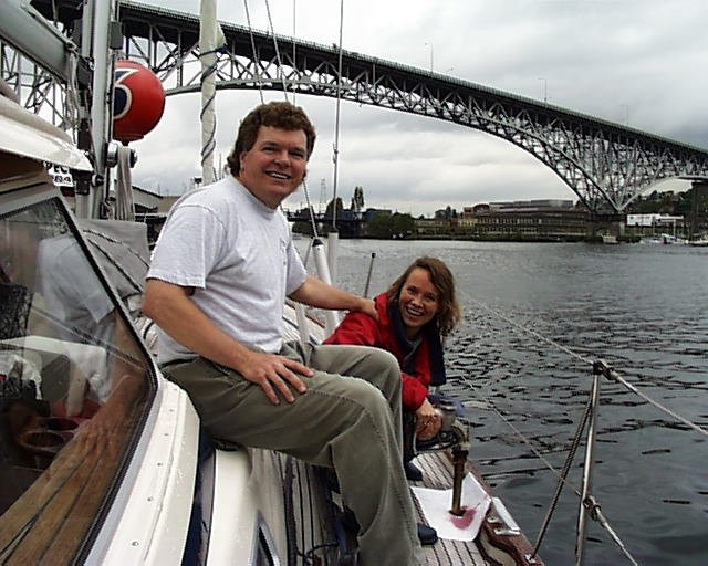 We’re Off! Monday 5/17 We're off! Our plans to depart from Seattle were delayed somewhat because of electronics. The navigation computer failed at the last minute, and so we expected a new laptop to arrive on Saturday the 15th, but Airborne didn't come through as expected, so we had to wait until Monday the 17th. In addition, I needed some additional time to get the e-mail connection working with the satellite. The last-minute work was completed early Monday afternoon, and so we were able to leave Sound Rigging on Lake Union at 14:30. Meet Guy and Tracey