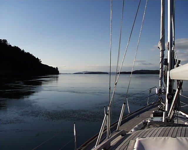 of the Fremont Bridge. Guy and Tracey are wonderful crew members. Over the next several years they are planning to purchase their own sailboat and cruise the Caribbean. In the interim Andanté will be their home for the next six weeks. They have proven to be eager learners, great crew with initiative, and wonderful people. Tracey is a flight attendant for Canadian Air, and Guy is listed in the Guinness Book of World Records for playing the most musical instruments (not at one time). In fact, Guy demonstrated his proficiency in a live television broadcast from Tokyo. The show was titled The World's Amazing People, and was viewed by 24 million who watched Guy play 186 instruments. He said he slept well after the performance. Guy did not bring any instruments on board, but did bring a fishing rod, which I managed to deposit overboard. But more about that later ... Flat Seas, but no wind So far we've hand incredibly flat seas, but alas, no wind. So we've mostly been motoring. Monday 5/17 This evening we made Port Townsend, arriving around 22:00--in the dark, in perfect calm, gliding on flat black water as the lights of Port Townsend cast a warm glow against the low overcast clouds.