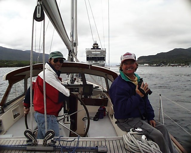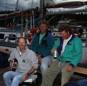 After dinner I don't know what came over me, but I brought out my guitar and several Beatles song books. A sing-along erupted on the dock, with some folks joining in, others just listening and tapping their feet, and others staring, in amazement, admiring the fearlessness and bravery that superceded talent and practice. Since much of the music was far beyond the vocal range of all male participants, we had to attempt it in falsetto. (Imagine the Beatles sung ala. Bee Gees.) The feast-turned-concert was ended by an act of God, namely rain. We all retreated to the sanctity of our cabins, and large stacks of dishes. Wednesday June 16 Windrush II's starter arrived via float plane. And after reinstalling it, the engine started the first time. Impressive. Andanté left Meyers Chuck around 12:45, and we ran immediately into 3-4 foot seas and 21-24 knot winds, bursting to 27. In these conditions it required some time to rig the port and starboard lifelines, and then set sail. Andanté pounded and rocked while we took a good amount of spray over the bow. We set a reefed main and genoa, and then turned to a broad reach, north in Ernest Channel. By the time all of this was done, and we were accurately on course, the wind died significantly, but not before Guy and Tracey got an opportunity to experience a common emotion among sailors in these conditions: fear. 18:10 Anchored in Frosty Bay. The cruising guide book indicated that this bay was home to 40 seals, but the seals must not have read the book because they were long gone. As we entered the bay we saw about 1/2 dozen crab traps, so I felt sure that we could succeed in harvesting some ourselves. Hauling up the trap after two hours in 60 feet of water, I got very excited as it neared the surface. Seeing an abundance of orange color, I congratulated myself on mastering the skill, expertise, and knowledge required to bring in such a catch. After all, I could feel the weight of the catch straining on the line. As the trap broke the surface, I stared in amazement to see a huge starfish clinging to the outside of the trap. This guy was about 3-1/2 feet in diameter from starpoint-to-starpoint. He was trying hard to get at the bait inside, but when he neared the surface, he simply let go, leaving me with an empty trap. Thursday June 17 We departed Frosty Bay at 9:45 heading for Wrangell, which we made uneventfully at 15:30. According to our cruising guide, Wrangell started as a stockage built by the Russians in 1834 to prevent encroachment by Hudson's Bay Company traders. The guide book goes on to say "Less sophisticated than other historic southeast towns, Wrangell has the feel of the Alaska frontier." This is a glamorous way of saying that Wrangell's 1800 residents fish, log, and drive very loud pickup trucks. Even if your pickup truck is relatively quiet, you make it loud by stomping on the gas pedal, even for short distances like two to three feet. In addition, the women in Wrangell are as large as the men, have deep husky voices, and any one of them could easily whomp me in a competitive sport, such as arm wrestling. It required all of five minutes to walk Wrangell's main street, after which we decided that we had seen it all. We did stop into a local bar where Wrangell's residents had gathered to award prizes for a recent sports fishing competition. But there were so many big-armed women in there that I just decided to leave as quickly as I had arrived--backing out carefully towards the door. Up Next ... |
