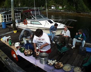 These ships are so large that they must use bow and stern thrusters to escape from the dock. With their thrusters on the entire ship moves sideways, away from the dock, until the captain has enough space to engage the engine. As we followed along in the large ship's wake, we became the subject of interest for many passengers on Mercury's stern. However, as the ship gained sea room beyond the narrow channel just north of Ketchikan, she quickly out-distanced us, and within an hour or so it became a small speck on the horizon and then quickly disappeared. In the meantime we sailed northeast in the western arm of the Behm Canal towards Naha Bay. Arriving in Naha Bay, we first checked out a public float at a little town (more like a collection of six houses than a town) called Loring. The float looked too small and unstable to hold Andanté. In addition, the most prominent resident of Loring (defined by the largest and most central house) peered at us with binoculars from behind her large picture window. Such close scrutiny made us a little uncomfortable. I mean, how often do you check out the new neighbors across the street with binoculars, for five minutes or longer, while they're looking back at you? So we kept moving, and motored slowly down a small finger east of Loring, eventually finding a small public float that's just large enough for Andanté to back into a corner. The location was beautiful and secluded, and we had it all to ourselves. Guy and I dropped the crab trap and eventually came up with ... nothing. While we were out in the dinghy, however, we spotted a school of small porpoises very close to us. And then, just a little later, we both heard breathing from something very large. Guy and I immediately looked at each other for reassurance. Interesting how quickly you can slip down the food chain up here, way up here in the Alaskan wilderness. Suddenly we heard the breathing again. This time, we were able to determine its direction--about a mile away, to the west, past Loring. There, close to the shore, a large plume of spray rose high into the air. It was another humpback whale--much larger than the pair we had seen previously. Monday June 14 Because we're ahead of schedule now, we slept in a little this morning. Around 7:30, however, small powerboats started to arrive at our secluded dock. From the warmth of my berth I could hear engines, followed by voices. Shortly after I heard another engine; this time much larger. I sat up and opened the curtains on the starboard side, just above my berth, as I blinked sleep from my eyes. I slowly focused on a bright turquoise tour boat, about 50 feet long, loaded with gawking tourists, who were gawking, at me. The tour boat was no more than 100 feet away, so I know they got a good look. I quickly snapped the curtains shut and hid under the covers. Fifteen minutes later I reawakened to the same scenario, this time with tour boat #2. Where are all these #@!%! tourists coming from, way up here in the Alaskan wilderness? Fifteen minutes later the scene repeated again with tour boat #3. I decided that sleeping in wasn't on the schedule today. Once dressed and out on the dock, the forest service boat arrived with their chain saws. "We're going to do some work on the trail," they said. "You'll probably hear us." Then, another boat arrived disgorging 30 people with backpacks. "We're going up to the camp to work on it," they said. "You'll probably see us on the trail." By now, 75 people have landed on our float and are "up the trail." We decided to pull lines and get underway to avoid being trampled "up the trail." Sailing north in Clarence Strait in ten knots of wind we aim for Meyer's Chuck, a small (tiny) little village with a public float in a protected bay. About an hour south of Meyers Chuck we receive a call on the VHF. It's our friends from Windrush II, calling from Meyers Chuck. They have been stranded in Meyers Chuck for several days due to a starter-gone-bad. The starter is now being rebuilt in Ketchikan, and they expect arrival tomorrow. We arrive in Meyers Chuck at 20:00 to find the public float very public, e.g. completely lined with fishing boats, power boats, and sailboats, including a couple from New Zealand on their sailboat called Spindrift. They have been cruising for a year, most of it in Alaska. Although the dock is completely taken, Windrush II invites us to raft up. By 21:00 I am preparing fresh fish (caught by Guy), supplemented by salmon. (OK, it's canned salmon, but we bought it in Alaska.) We dine in the cockpit by candlelight. Tuesday June 15 Today we decided to stay in Meyers Chuck. Tracey and I slept in, but Guy disappeared early. Off fishing again, he returned around 10:00 with a dozen rock cod and sole. In the meantime, Dick and Lee from Windrush II are out digging clams on the beach, and return with half of a 5-gallon bucket filled with steamers. Unsatisfied, they head out in the dinghy, and return several hours later with 30 crabs in their trap. They had found a crab bed at low tide, and skimmed over it in the dinghy while simply leaning over with the fish net and scooping 30 of 'em up. Is this legal? What with the fish, clams, and crabs, a plan soon hatched to have a seafood buffet on the dock at 18:00. With the banquet time set, the balance of the day revolved around cleaning the fish, cleaning and boiling the crabs, and then preparing the feast. Initially, three boats and ten people were involved, but it later grew into four boats and 13 people. Dick, on Windrush II, befriended a local resident from Meyers Chuck (there are only five of them) who brought over a 20-foot long spruce plank which, covered with towels, became the banquet table on the dock.