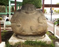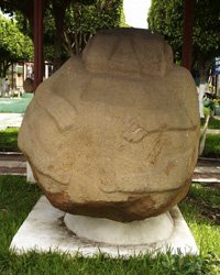 Today Santiago Atitlán retains the core of an active and authentic Mayan town. But vendors aggressively call out to introduce their wares, and young children follow you constantly with beaded bracelets and plastic pens. Even in shops that look uninteresting and predictable, a discriminating eye can find unique treasures. Amid the hundreds of crafts that look very much the same we found some amazingly beautiful Guatemalan textiles, pottery, and wood carvings. Never pay retail. Bargaining is an art in Central America. If you're interested in something, don't show it. The price goes up. And they're very good at reading body language. The best approach is to negotiate, and then walk away. You will be pursued with a better offer. National Geographic quality photos lie in wait around every corner. But beware: capitalism has conditioned most people to ask for money—usually a quetzal—if you ask permission to take a photo. Some photos are worth a quetzal. Most are not. One lady showed me a small coin to communicate her availability for modeling in exchange for payment. When I took the photo and produced the same coin that she originally showed me, the price went up to a quetzal. Candid photos are difficult to shoot, because people will often shield their faces from your camera. Olmec Carvings in Democracia; Return to Puerto Quetzal Wednesday morning, June 7th, after even more shopping in Panajachel, we climbed into Mike's taxi for the return drive to Puerto Quetzal. Along the way we stopped in Democracia where this small town's central park displayed large Olmec carvings of people and faces. An Olmec museum across the street from the park promised more detail, but it was closed when we arrived Wednesday afternoon.