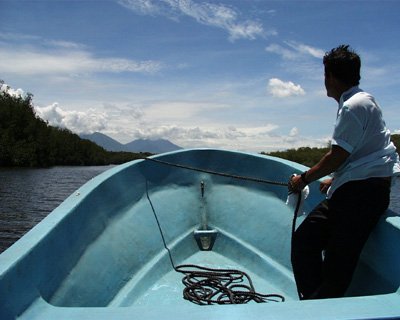 Monday, June 12th, 2000—The half hour panga ride to Puerto El Triunfo, courtesy of Barillas Marina, turned out to be a fascinating side trip. Thirty minutes away by panga that sped along between 35-40 MPH, El Triunfo gave us an opportunity to see a genuine El Salvadoran village unseen by most tourists and consequently untouched by commercialism. We sped along past miles of lush green mangroves that lined the waterway, under deep blue skies. Silhouettes of volcanoes anchored the horizon. Occasionally you could see mud-lined crocodile paths for sliding out of the dense, swampy mangroves. Although we never spotted a croc, we viewed their habitat up close with several dinghy trips into small inlets underneath the dense mangrove canopy. The local navy base handled necessary port captain duties, such as writing up our new international zarpa to Costa Rica, and also signing and stamping our crew list. Conveniently, the immigration building was directly across the street from the navy base. Our immigration officer was extremely thorough in executing his duties, and very curious about where we came from, how long we had been out sailing, where we were planning to sail to, and why I chose the name Andanté. The word andante means a slow walk in Spanish, so the name is well understood throughout Mexico and Central America.