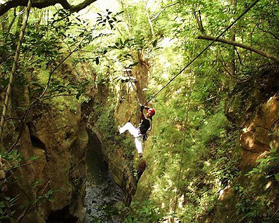 Canopy Tour, Arenal Volcano, and Tabacón Resort Thursday, June 22nd, we rented a Rav 4, suitable for an inland tour of the country with its many non-paved roads. Costa Rica might have the most stable political system in the region, but its substandard road system leaves a lot to be desired. It seems as if every 10-foot stretch of pavement has an equal number of patches. We drove east from Playa del Coco to Liberia, and then north for perhaps five miles. We then turned east, towards the mountains, for a 30-minute drive on gravel roads that sorely needed more grading. We arrived at The Original Canyon Tour, which operates something called the Kazm Cannon in the Rincón Volcano National Park. Essentially you strap into a climbing harness and ride through the canyon on a series of cables strung between platforms.