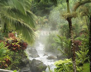 The Spa at Tabacón Lodge is an amazing landscaping and engineering project. Natural hot springs have been diverted into 20 or more terraced swimming pools, hot baths, and natural-looking ponds, flowing with thermal water heated by Arenal Volcano. The hot water creates clouds of steam that permeate the air with a slight trace of sulphur. Waterfalls run through many of the pools, creating many different sounds of rushing water, that fill the Spa. Temperature varies from pool to pool. It surprised me that the largest swimming pool—with submersed bar at one end, and a water slide at the other—appeared to be the hottest of all. I climbed the stairs for the water slide with the intention of sliding down into the pool. When I reached the top and sat down in the rushing water, I couldn't believe the temperature. It was well over 100º F, and almost too hot to sit in. Actually, it was too hot to sit in. I slid down this scalding water chute, anticipating relief at the bottom, only to plunge into ... more very hot water.
