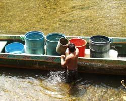 Instead, we learned that Federico, and other villagers, make the trip upriver four or five times a week to collect drinking water. They travel in ulussome with outboard motors; but most paddled by hand. They travel to an area of the river where the "water is fresh and clear." This turns out to be a bend in the river where the water is fast-flowing and least stagnant. Here they fill large plastic containers with the river water, and then paddle the return trip back to the village. The untreated water is used for drinking and food preparation. That night I had second thoughts about all the work I had to invest in my water maker. It all seemed worth it: near distilled quality water at only 240 parts per million with the flip of a switch. Federico also took us to the village burial groundslocated, incidentally on a high section of ground upstream from the water collection site. The Kuna cemetery contained about 50 graves. Family members had placed belongings of the deceased person on the top of each grave. Similar to the Egyptians, Kunas believe that inanimate objects also have a spirit, and that these objects can assist the deceased person in the afterlife. So the person's possessions are left at the gravesite. If this is not done, the person's spirit will return to collect the articles.