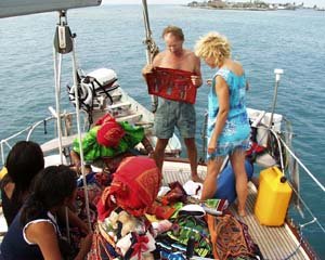 Encouraging the women to leave the boat. Now that proved to be a bit of a challenge. Between the four of us we probably spent about $150 US. But from their perspective, there were buckets more of molas to buy, and as far as they were concerned, we had buckets of cash to buy them with. Eventually, we did convince them that we really, honestly, sincerely, didn't want to buy any more molas. As far as my negotiating skills, I was able to get several free photographs out of the dealeven though I had to give a couple of molas back. But they were small molas. And I only have to write royalty checks for three years instead of four. So really, I came out ahead. I just shouldn't have given my American Express card number as collateral. I felt privileged to shoot any photographs at all, because most Kunas shun photographs. Kuna traditions taught that their souls passed from their bodies in through the camera lens. Just Like the South Pacific, Only Better Friday afternoon we sailed from Porvenir to the Western Naguargandup Cays, a secluded anchorage that Heather selected from the guide book. The next morning, before we had gained consciousness, a steady stream of dugout canoes approached us with drive-buy capitalism. First came a mola-selling family: father, mother, and little boy. We bought. Next came Venancio Restrepo, the "master mola maker." (Probably a registered copyright.) We bought. Next came two guys selling fresh crab. We bought. Next came another family: father, mother, and young infant. "No mas molas," I pleaded. Mom was extremely displeased. She let it be known with a look that was licensed to kill, and a few choice words that I did not understand, but did get the gist of. Later in the day, despondent and all alone in my aft cabin, I sat sullenly, trying to figure out how all my money could disappear in these remote anchorages. But later that evening we feasted on fresh crab and a bottle of Chilean wine, which made things a little better. We anchored off a series of palm-tree lined, white sand islands that rival anything in the South Pacific.