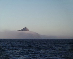 As we turned south around the northeastern corner of Santa Cruz Island, we came out of the fog curtain; its ceiling floated 100 feet above us. Safely anchored in Smuggler's Cove on the eastern shore of Santa Cruz Island, we could see the thick walls of fog on the northern and southern sides of the island. The fog, combined with the setting sun, cast delicate shades of purple and lavender on Anacapa Island, and inside Smuggler's Cove. Tuesday October 12 Tempted by the opportunity to explore a sun-drenched olive orchard rising on a hill above Smuggler's Cove, Jenny and I set out in the dinghy to attempt a landing. Although we could see breakers all along the beach, we thought it might be possible to land the dinghy--with careful timing. As we approached, we realized that the swells rolling underneath us were 4-5 feet high, with breaking whitewater 30-40 feet out from shore. Allowing self-preservation to suppress our curiosity, we reluctantly turned back to the boat, not wanting to capsize the dinghy in breaking shore waves.