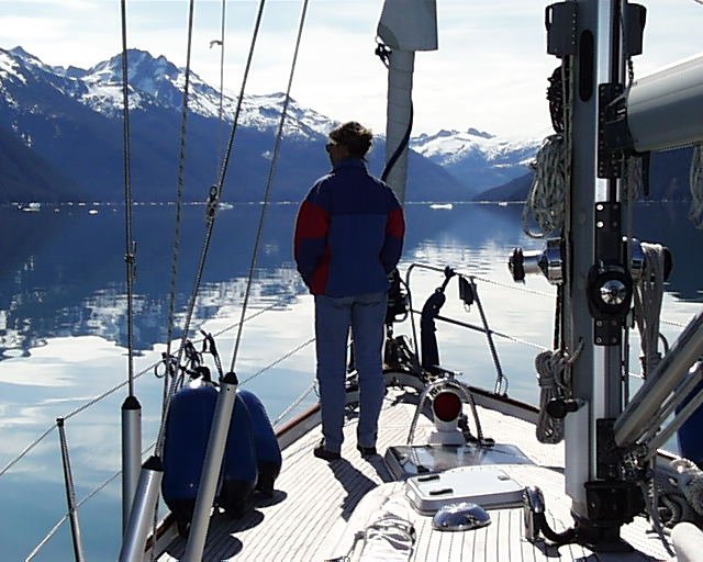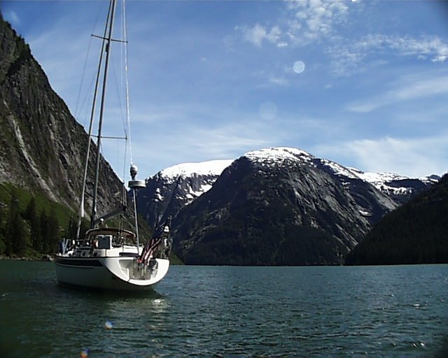 Having cleared the obstacles in the narrows, both human and natural, we wound our way north, and then west, to an anchorage that can only be described as spectacular. Picture an oval basin, about two miles long, with steep rock face mountains on all four sides rising up from the water to 5000 feet. All four mountains are capped with snow. The western mountain, the one we are closest to, starts with a snow field at the top, and cascades into a large waterfall, perhaps 1000 feet or more in width. This waterfall covers the entire vertical face of the mountain, straight down to the water. It creates a thunderous wall of white noise that completely fills the anchorage. As we anchor, a large black bear meanders out of the forest and down to the water's edge. Because the waterfall obscures other sounds. So, he didn't hear us until a noise from our anchor alerted him to our presence, after which he turned tail and ran back into the woods. After anchoring (deep) in 100 feet of water, sunlight streams down from a cloudless blue sky, allowing us to sit on deck in T-shirts and shorts--a much needed respite after days of rain. I lay down on one of the foam cushions in the cockpit, listening to five waterfalls surrounding us, basking in the sun, and drift slowly and peacefully off to sleep. |