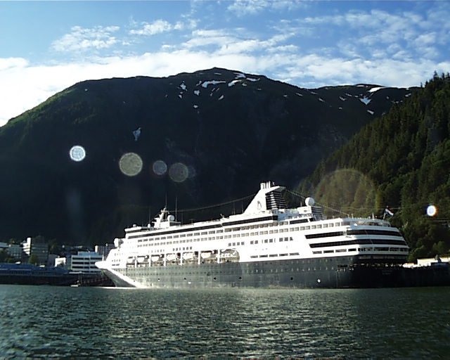 In the spirit of participational education, I have developed a little Juneau quiz. for you: Juneau has a population of: a) 8,000 b) 30,500, or c) 50,000? If you selected 30,500, you were right. But the city also has an adult eagle population of a) 2,500, b) 5,000, or c) 10,000 adult eagles? If you selected 'c,' you win again, with 10,000 adult eagles. Juneau receives 250 days of rain annually, with 278 cloudy days, and the heaviest rain months occur in: a) November and December, b) September and October, or d) January and February. Those selecting September and October are right again. On the summer solstice, Juneau receives 18 hours and 18 minutes of daylight, but dawn and dusk makes it light from about 2:30 in the morning until 23:30 at night. During the winter solstice, they only get six hours and 21 minutes of sunlight--it's pitch dark at 15:00. According to a survey by the L.A. times, Juneau is the fifth most popular cruise destination in the world, based on scenic beauty and shopping. Consequently, Juneau receives the following number of cruise passengers each year : a) 250,000, b) 500,000, c) 750,000? The answer is closer to 'b,' with 570,000 passengers arriving via cruise ship, out of 680,000 total tourists. True or false: You can get to Juneau by air, road, and sea. The answer is--false. You can only get to Juneau by air and sea. Although there are several hundred miles of paved road around Juneau and its environs, all roads dead-end. (Actually, many of them have round-abouts at the end, so you can turn around in the circle.) The story of Patsy Ann--local towns-dog. Patsy Ann lived in Juneau during the 1930s, and became famous (it's a relative term) for meeting every ship that came into the harbor, even though she was deaf since puppy-hood. In fact, more than famous, she became a legend (also a relative term), and in 1934 the mayor bestowed upon her the title of Official Greeter of Juneau, and made her exempt from licensing. (You know you've made it when the local government gives you tax-free status.) How did she do it? Some suggested she could 'feel' the boats coming (no specific explanation of how she did this). Some suggested canine premonition. More plausible is the suggestion that, because she hung around the longshoremen's hall, she simply followed the longshoremen down to the docks. Although Patsy Ann died in 1942, the town erected a memorial statue in 1992. According to Director Linda Blefgen at the Gastineau Humane Society, she continues to receive letters from people all over the world who have visited the statue and want to know more. These are people who lead relatively secluded lives, but that's OK, I'm not making any judgements here. If all this wonderful history has only whetted your appetite about Juneau, and you have to have more information, check out these web sites: