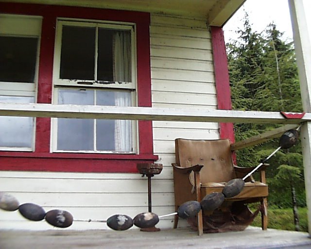 At 16:00 we heard whales surfacing, only this time the sound was much louder and deeper. We spotted a pair of humpback whales at 52º 51.49N, and 128º 28.62 west. The small dorsal fin that protruded from the surfaces belied the mass hidden below. We had two confirmations that we were looking at humpbacks: you can hear from their breathing that the lung capacity of these creatures is enormous—significantly larger than the Orcas. In addition, when they turn underwater for a deep dive, their large tails flip gracefully out of the water. The width of the tails appeared to be 15 feet across. Humpbacks migrate from the tropics in the winter to the Alaskan ice pack in the summer. We turned to follow. Like the Orcas, the pair of humpbacks proved to be illusive. At one point they surfaced 50 yards in front of us, only to swim under Andanté and surface on the other side. We keep our distance. After watching them for perhaps half an hour, we turned back on course. Another mystical, magical experience. 21:30 - we anchored in a small bay in an old ghost town called Butedale. Our anchorage was challenging because the depth was 90 feet off the bow. A preferred 7:1 scope of rode (chain) would have required 560 feet. We only had 300. We managed to get the anchor hooked, and then backed towards the shore where Guy, from the dinghy, looped several stern lines around three large pilings close to shore. We strung between anchor and pilings, but a nearby stream helped provide enough current out from shore to keep us perpendicular to large wakes generated by passing cruise ships out in the channel. Thursday 6/3/99 Guy started the morning by attempting to catch a fish, but came up with an octopus instead. After debating a) the difficulty of cleaning and b) the edibility of the creature, he (she) got returned to the sea. Later in the morning we took the dinghy to shore for a tour of Butedale. There we met Cindy and Russell. Russell is the official (perhaps non-official) caretaker of Butedale. He struck us more like a hippie escaping from society, particularly since seemed to be falling down more than being preserved. Cindy was an Oregon resident who has come up for the summer to help in the slow-motion restoration. Butedale's owner, a Canadian living in California, is investing some money to renovate the property, but the reality seems to be two steps backward for every one forward.