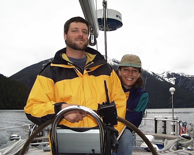Upon retiring to the boat, in celebration of my losses, I removed my guitar from its case and started to work through the complete Eagles song book. Guy and Tracey joined in with harmony, while Todd and Lara tried to sleep. Well over an hour into our revelry, Todd came out to join in on harmony for Seven Bridges Road, after which he retreated as quickly as he arrived. Guy and I have decided to buy an 80-foot sailboat so that each member of the (yet-to-be-formed) band can have his or her own stateroom while we tour the world. We think we can have the boat paid for by 2050, give or take a decade or so. Tuesday June 8 The marine weather calls for a ridge of high pressure to remain off-shore, leaving us with scattered showers and fog. We leave our rolling dock space at 10:35 and refill our fuel tank at a nearby Petro Canada. Afterwards, we head for Venn Passage. Venn Passage is the northwestern escape route from Prince Rupert, and is strewn with many twists and turns, navigation buoys, and range markers. Range markers are navigation aids used in narrow, shallow channels, defined by two markers which line up with one another to keep you on the appropriate course through the channel. A little over an hour later we have twisted, turned, and squeezed our way through Venn. It is cold and overcast, but not raining. Todd and Lara bring us sailor's luck: we sail for almost four hours this afternoon, the longest sailing stretch on our voyage so far. As we sail across Dixon Entrance--our second longest passage of the trip--we leave British Columbia behind and reach north into Alaska. Unlike our crossing of Queen Charlotte Sound, Dixon Entrance is like a bathtub. 17:30 - Three or four whales appear, spouting along the shoreline. We turn to head in for a closer view, but dare not push in too far because the chart is peppered with asterisks--chart symbols for rocks. 20:21 - We thread our way through rocks and reefs into a secluded bay (Foggy Bay) that is well protected from wind and waves, and anchor in 40 feet of water on 120 feet of rode (chain). This short 3:1 scope is possible because the anchorage is to protected and calm, and necessary because there are already five boats here. The anchorage is small, perhaps 200 feet wide b y 400 feet long. One of the sailboats here is Dancer; we originally met them in Butedale six days ago. After making sure the hook will hold us tight, I duck downstairs for a hot shower as the sun sets. Inside my steamy shower I hear Guy calling to me from the starboard aft deck. He is fishing from the deck, but has spotted a black bear on the shore. I open the portlight (window) in the shower, and see a small black bear on the not-too-distant grassy shore. He appears to be a young cub, perhaps two years old, and is alone on his little island. Watching from the warmth of my steamy shower, I decide that this is the first and last bear that I ever want to meet without any clothes on. (Me, not him. Although the description correctly refers to both of us.) By the time I'm out of the shower and squeaky clean, two pizzas emerge from the hot oven. We sit in the warm glow of our cabin lights, dining on slices of fresh pizza, rocking gently in the bay as we listen to soft music. I can't imagine a nicer evening. Up Next ... |