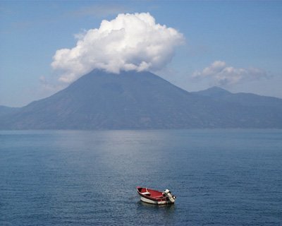 Monday evening we drove north through Guatemala's mountainous countryside to Panajachel at the base of Lake Atitlán, which has been described as one of the most picturesque lakes in Central America. Sixteen miles long, and 11 miles wide, Lake Atitlán fills the enormous crater of an extinct volcano. The inactive Atitlán volcano—with an altitude of 11,604 feet—frames the southern end of the lake. The hotel accommodations in Atitlán ranged from Spartan, at about $10 per night, to expensive, at $110+ per night. After investigating five different hotels, we discovered Hotel Dos Mundos—comfortable and clean, with swimming pool and breakfast included, for a mere $34 per night for a double. Tuesday morning, June 6th, we negotiated with several entrepreneurial young Panajachelians for a boat ride across the lake to Santiago Atitlán—a Mayan town offering arts and crafts, as well as significant indigenous culture. Santiago Atitlán is also important in recent Guatemalan history because of a military massacre of Indians there on December 2nd, 1990. The Atitlán massacre was instrumental in United States' decision to cut off military aid to Guatemala because of the country's extremely weak record regarding human rights.