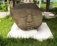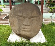 Today Santiago Atitlán retains the core of an active and authentic Mayan town. But vendors aggressively call out to introduce their wares, and young children follow you constantly with beaded bracelets and plastic pens. Even in shops that look uninteresting and predictable, a discriminating eye can find unique treasures. Amid the hundreds of crafts that look very much the same we found some amazingly beautiful Guatemalan textiles, pottery, and wood carvings. Never pay retail. Bargaining is an art in Central America. If you're interested in something, don't show it. The price goes up. And they're very good at reading body language. The best approach is to negotiate, and then walk away. You will be pursued with a better offer. National Geographic quality photos lie in wait around every corner. But beware: capitalism has conditioned most people to ask for money—usually a quetzal—if you ask permission to take a photo. Some photos are worth a quetzal. Most are not. One lady showed me a small coin to communicate her availability for modeling in exchange for payment. When I took the photo and produced the same coin that she originally showed me, the price went up to a quetzal. Candid photos are difficult to shoot, because people will often shield their faces from your camera. Olmec Carvings in Democracia; Return to Puerto Quetzal Wednesday morning, June 7th, after even more shopping in Panajachel, we climbed into Mike's taxi for the return drive to Puerto Quetzal. Along the way we stopped in Democracia where this small town's central park displayed large Olmec carvings of people and faces. An Olmec museum across the street from the park promised more detail, but it was closed when we arrived Wednesday afternoon.