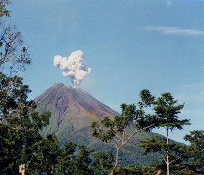 The main attraction in this region is active Arenal Vocano (shown at left from a scanned postcard). Arenal exploded in July 1968. About 90 people died from the blast. Over 4,000 people became homeless. The eruption covered the surrounding cattle grazing lands with volcanic ash. The destruction of the grazing land forced local ranchers to slaughter 80,000 cattle, and to move 100,000 to other pasturelands. Volcanologists think that Arenal could have another large eruption at any time. In the interim, small eruptions and lava flows occur daily. Low rain clouds obscured the volcano for us. However, as we drove along through the night, off to the side we spotted bright red-orange lava spilling down the mountain, beneath the cloud layer. We stopped at Restaurante El Novillo, an unassuming steak house with a fantastic view of the volcano only two miles distant. Seating for the entire restaurant is outside to accommodate volcano watching. We settled into white plastic chairs and enjoyed grilled steaks while we watched the lava flow down the mountainside. Thursday evening we attempted to stay at the Tabacón Resort and Spa. They were completely sold out. However, Tabacón Lodge did have a package with the nearby Volcano Motel that included a very nice clean room, and two day access to the Tabacón Spa, with breakfast included.