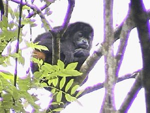The stop did have some highlights however. As we approached the large enclosed butterfly tent we heard a large group of howler monkeys making deep, low barking noises in the adjacent trees. Most of them were in a cluster of trees hidden from our sight. One, however, sat placidly within view. I only had the video camera, and the intensely bright backlight made it difficult to get a good shot. But shutting down the exposure enabled me to capture the image at left. A parrot inside the butterly tent provided another highlight. This parrot had learned to talk by listening to people walking at a distance. He spoke few words that you could actually understand. Instead, he mumbled. If the proprietor had replaced the 'butterfly farm' sign with another that said "Costa Rica's Mumbling Parrots," I'm convinced that he could have doubled his market. Click here to hear mumbling parrot impression. (185k download) That evening, when we returned to Playa del Coco, we took advantage of the Rav 4 to fill our two diesel jugs and add more fuel. Over the past several days I had run the engine to power the watermaker, and the fuel gauge read empty. I added the contents of both jugs and discovered that, with 12-gallons, the fuel tank read 55% tank capacity. This with a 110-gallon tank. Flamingo Bay Saturday, June 24th, we returned the rental car, purchased groceries in Playa del Coco, and motored south to Flamingo Bay, where we needed to take on fuel. We departed Playa del Coco at 16:16 and arrived at 18:30. Sunday, in Flamingo Bay, we filled the fuel and—what a luxury—the water tanks. Snorkeling and Friends in Bahia Brasilito We left Flamingo Marina at 13:00 on Monday, the 26th, and sailed around Catalina Island with the hope of finding a place to anchor so that we could dive the island's perimiter. No such luck. The depth sounder registered 90 feet only several hundred feet from the island's shore. Instead, we sailed further south to Bahia Brasilito where we met Jeff and Ann Brooke on High Drama, a Passport 51. It turns out that I had met Jeff and Ann previously when their boat broker, Vickie Vance, invited them to travel through the Seattle locks with me on Andanté, just after her commissioning in May 1997. Tuesday morning we snorkeled the rocks and reefs at the entrance to Bahia Brasilito. Later in the afternoon Jeff and Ann invited us on board, along with Joe and Lisa Gerardin form Net Result. We had previously met Joe and Lisa at Barillas Marina in El Salvador. Return Sail North to Bahia Murcielagos and Bahia Santa Elena Wednesday morning, June 28th, we departed Bahia Brasilito for a return trip to the Murcielagos, or Bat Islands. It required about four hours to cross the Gulf of Papagayo. Throughout the trip we were frequently accompanied by dolphins—perhaps 50 or more in 6-8 pods. At one point we slowed to less than 2 knots while they floated gently along with us. That afternoon, at 16:00, we anchored between Isla San Jose to east and Isla Cocinero to west. Heavy winds blew in late afternoon, and remained all night long, with bursts up to 27 knots. We set out our small Bruce stern anchor to hold us into the wind, but the Bruce just doesn't hold back there. We have decided to replace it with a 25-pound West Marine High Performance anchor. Thursday morning, the 29th, we took the dinghy out into the channel between Isla San Jose and Isla Cocinero to snorkel, as we had done almost two weeks ago. This time a heavy 3-4 current streamed in between the islands, making it impossible to snorkel. Instead, we beached the dinghy on the east side of Isla San Jose, and snorkeled along the island's rocky shore. Fast current and heavy waves made it very difficult.