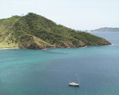 Monday evening, June 12th we detached the mooring buoy at Barrillas Marina and motored out through the waterways that returned us to the Pacific for the 206 mile passage to Costa Rica. We decided to skip Nicaragua this time, but hope to spend ample time on that country's eastern coast. The name Costa Rica, literally "rich coast," was bestowed by none-other than Christopher Columbus, who sailed Costa Rica's eastern shore in 1502. Spanish conquistadors followed starting in 1561. Spanish rule ended in 1821, and for three years Costa Rica became a part of Mexico, and after that, part of the United Provinces of Central America from 1824 to 1838. Dictatorships prevailed throughout the remainder of the 1800s, after which democracy followed in the 20th century. In 1948, Costa Rica abolished the military when the PLN, the dominant political party, came to power. Consequently, Costa Rica has enjoyed 50 years of stable democratic government. Like other Central American countries, Costa Rica's 3.6 million people descend primarily from Spain. Similarly, most of the population, about 96 percent, is either white or mestizo (people of mixed Spanish and Native American ancestry). But there is also a small black community of Jamaican origin. Forests cover one-third of Costa Rica's geography, which is comprised mostly of land above 3,000 feet. But for cruisers, the exiting part of Costa Rica is, as Christopher Columbus expressed it, the "rich coast." Our passage to Costa Rica was uneventful, and on Wednesday, June 14th we arrived in Bahia Santa Elena. Bahia Santa Elena's large protected bay sheltered us completely from winds and waves, and gave us a two-day rest after our three-day passage. We arrived in Bahia Santa Elena, Costa Rica, on Wednesday the 14th. Charlie's Charts of Costa Rica, a cruiser's guide with descriptions and sketches of hospitable bays, illustrated Santa Elena's surrounding flora as palm trees. No palms to be seen. Instead, lush leafy trees and brush covered the surrounding mountains with a vibrant green. Parrots squawked unseen in the foliage, and sometimes vibrantly colored pairs flew overhead. Charlie's informed us that five different kinds of cats lived in the surrounding jungle, including ocelots, jaguars, and pumas. Punctuating the still evenings, dozens of small bait fish frequently exploded from the placid water, skipping outward in star like patterns to avoid larger fish searching for food. Bahia Murcielagos—The Bat Islands