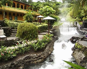 The Spa at Tabacón Lodge is an amazing landscaping and engineering project. Natural hot springs have been diverted into 20 or more terraced swimming pools, hot baths, and natural-looking ponds, flowing with thermal water heated by Arenal Volcano. The hot water creates clouds of steam that permeate the air with a slight trace of sulphur. Waterfalls run through many of the pools, creating many different sounds of rushing water, that fill the Spa. Temperature varies from pool to pool. It surprised me that the largest swimming pool—with submersed bar at one end, and a water slide at the other—appeared to be the hottest of all. I climbed the stairs for the water slide with the intention of sliding down into the pool. When I reached the top and sat down in the rushing water, I couldn't believe the temperature. It was well over 100º F, and almost too hot to sit in. Actually, it was too hot to sit in. I slid down this scalding water chute, anticipating relief at the bottom, only to plunge into ... more very hot water.