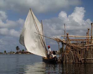 Encouraging the women to leave the boat. Now that proved to be a bit of a challenge. Between the four of us we probably spent about $150 US. But from their perspective, there were buckets more of molas to buy, and as far as they were concerned, we had buckets of cash to buy them with. Eventually, we did convince them that we really, honestly, sincerely, didn't want to buy any more molas. As far as my negotiating skills, I was able to get several free photographs out of the dealeven though I had to give a couple of molas back. But they were small molas. And I only have to write royalty checks for three years instead of four. So really, I came out ahead. I just shouldn't have given my American Express card number as collateral. I felt privileged to shoot any photographs at all, because most Kunas shun photographs. Kuna traditions taught that their souls passed from their bodies in through the camera lens. Just Like the South Pacific, Only Better Friday afternoon we sailed from Porvenir to the Western Naguargandup Cays, a secluded anchorage that Heather selected from the guide book. The next morning, before we had gained consciousness, a steady stream of dugout canoes approached us with drive-buy capitalism. First came a mola-selling family: father, mother, and little boy. We bought. Next came Venancio Restrepo, the "master mola maker." (Probably a registered copyright.) We bought. Next came two guys selling fresh crab. We bought. Next came another family: father, mother, and young infant. "No mas molas," I pleaded. Mom was extremely displeased. She let it be known with a look that was licensed to kill, and a few choice words that I did not understand, but did get the gist of. Later in the day, despondent and all alone in my aft cabin, I sat sullenly, trying to figure out how all my money could disappear in these remote anchorages. But later that evening we feasted on fresh crab and a bottle of Chilean wine, which made things a little better. We anchored off a series of palm-tree lined, white sand islands that rival anything in the South Pacific.